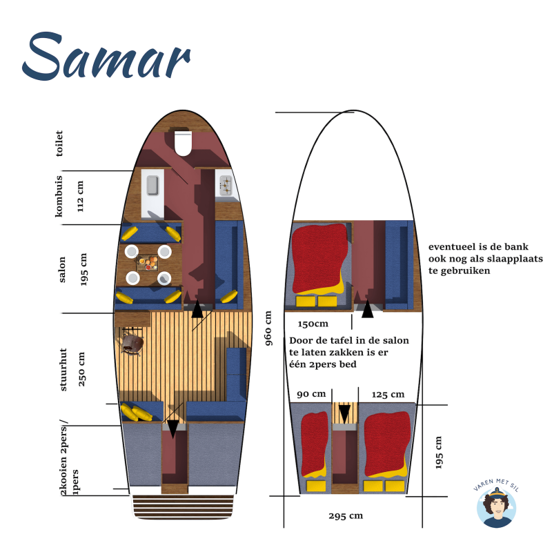Samar is 9,60 meter lang, 2.95m breed, 0.95m diep en 2.30m hoog.